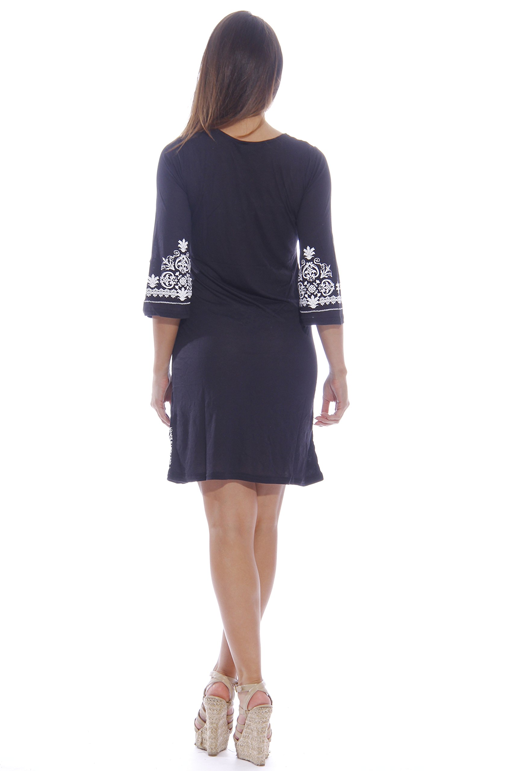 - LOOK SIMPLY STYLISH: You’ll love the embroidered look eye-catching print that contrasts beautifully with the bold colors. The women swim cover up also comes with a lovely neckline and ¾ bell sleeves to make for unmistakably stylish resort wear.